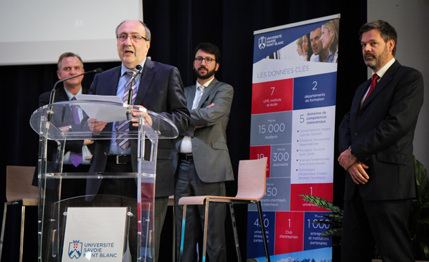 Cette rencontre a également permis d’officialiser la convention de partenariat signée entre les deux établissements à l’été 2015 pour une durée de 5 ans. Denis Varaschin, président de l’USMB, a brièvement rappelé les termes et objectifs de la convention avant de remercier les membres de la délégation UniDistance présents : Stéphane Pannatier, directeur administratif d’UniDistance, Jean-Michel Jullien, responsable EDUDL d’UniDistance, Dr Damien Carron, directeur académique d’UniDistance, et Prof. Dr Marc Bors, recteur d’UniDistance.