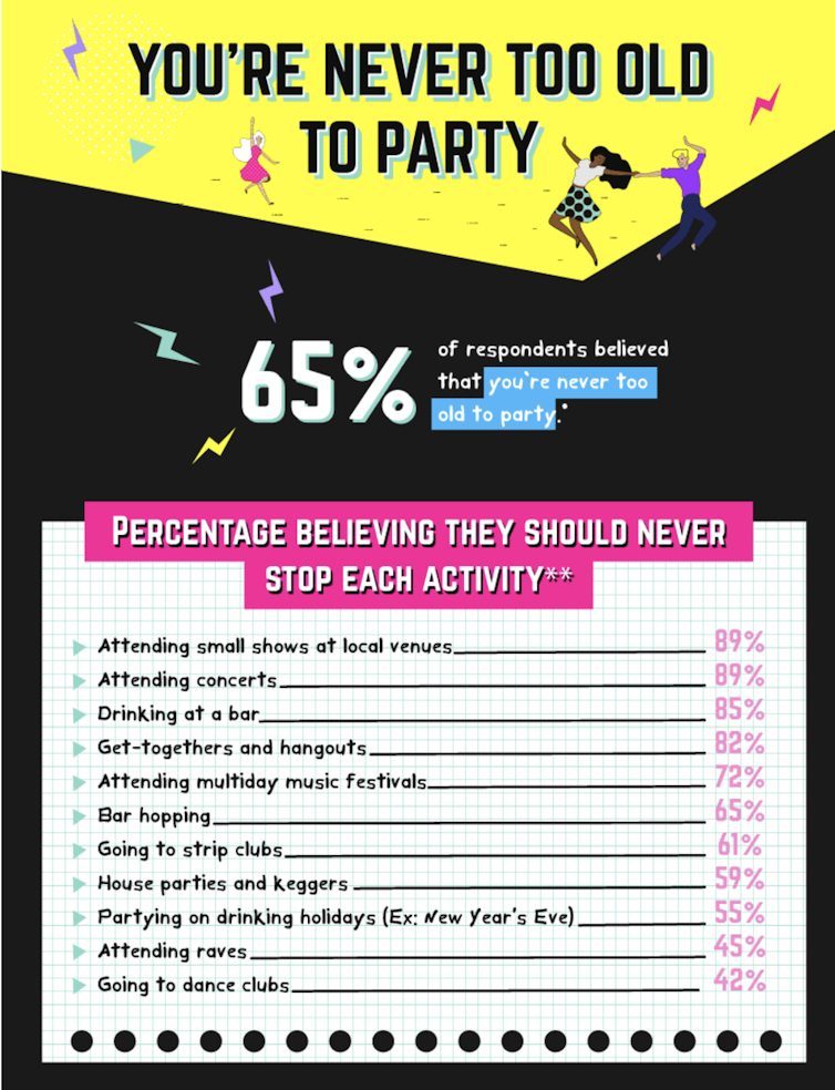 Or, la communauté électro et donc celle des festivaliers s’est élargie. Nombre de quadragénaires et quinquagénaires souhaitent fréquenter les festivals électro, de la même manière qu’ils fréquentent les festivals de musiques actuelles (35 ans de moyenne d’âge). Une récente étude menée aux États-Unis montre que 67 % des gens pensent qu’on n’est jamais trop vieux pour faire la fête, et même 72 % pour aller dans voir des concerts durant plusieurs jours.