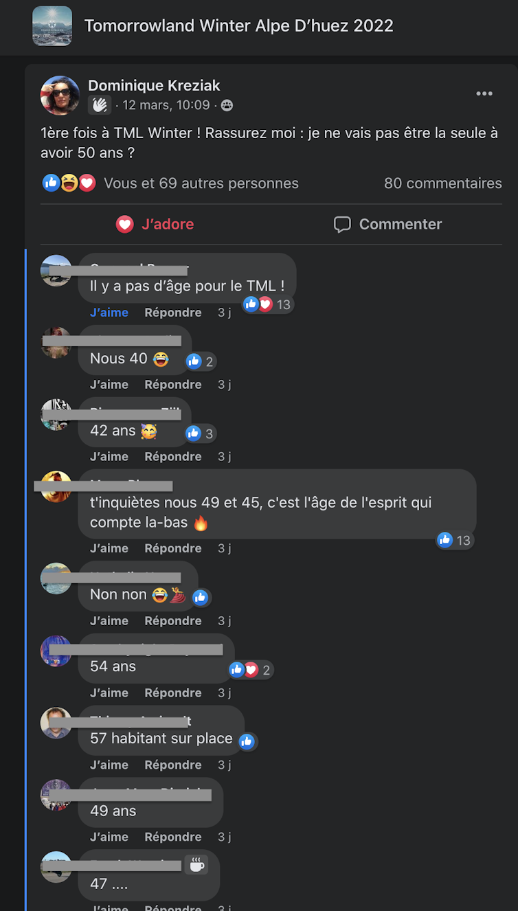 La présence des plus jeunes n’affecte à priori pas la légitimité des quinquagénaires voire même des sexagénaires présents sur le festival. Pour eux, « il n’y a pas d’âge pour le TML », « C’est l’âge de l’esprit qui compte là-bas » (Manu, 49 ans). Ils ne se posent pas forcément la question, et sont très à l’aise dans le festival dont ils adoptent les codes notamment concernant la tenue vestimentaire, ce qui est aussi à mettre en relation avec le privilège de classes éduquées/dominantes qui tendent à se sentir à leur place partout. Le fait que le groupe des quadras-quinquas soit conséquent renforce cette légitimité : comme le dit un participant du forum des spectateurs « T’inquiète, les cinquantenaires seront là ! 57 ans et deuxième festival Tomorrowland Winter ! »