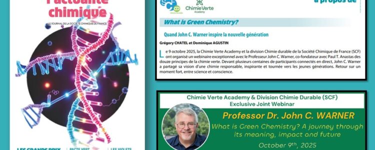 Intitulé “What is Green Chemistry? Quand John C. Warner inspire la nouvelle génération”, l’article revient sur le webinaire exceptionnel organisé le 9 octobre 2025 en collaboration avec la Société Chimique de France, réunissant plus de 400 participants en direct et plus de 400 inscriptions pour le replay.