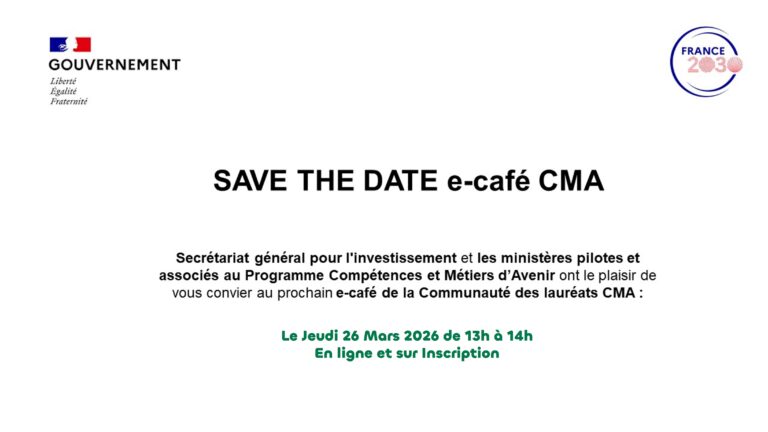 Le Secrétariat général pour l’investissement et les ministères pilotes et associés au Programme Compétences et Métiers d’Avenir ont le plaisir de vous convier auprochain e-café de la Communauté des lauréats CMA :