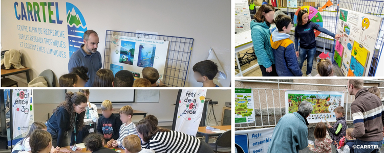 Le Centre Alpin de Recherche sur les Réseaux Trophiques et Ecosystèmes Limniques (CARRTEL) a accueilli pendant la Fête de la Science plus de 400 visiteurs sur son site de Thonon-les-Bains. Quatorze ateliers et stands étaient proposés, avec la participation de quatre partenaires – le Géopark Chablais UNESCO, la Ligue pour la Protection des Oiseaux (LPO), les bureaux d’étude Subbear et Scimabio Interface – autour de thématiques majoritairement liées au fonctionnement et à la biodiversité des milieux aquatiques. Des conférences, des entretiens de type « speed-searching » et des jeux scientifiques étaient également proposés tout au long de la journée, offrant aux visiteurs un large panorama des recherches menées par le CARRTEL sur les écosystèmes lacustres et les enjeux qui y sont associés.