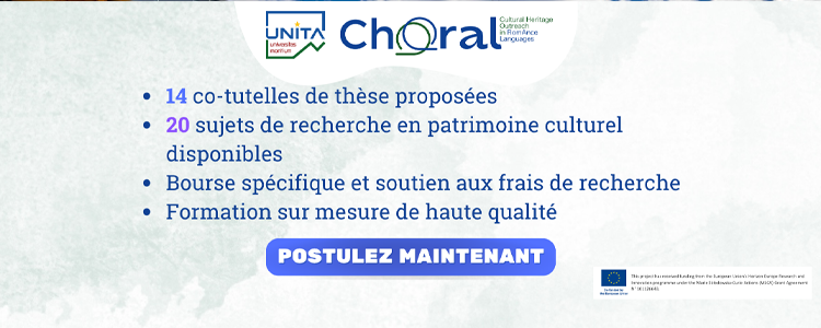 Le programme doctoral CHORAL (Cultural Heritage Outreach in Romance Languages), coordonné par l’université de Pau et des Pays de l’Adour (UPPA) et cofinancé par l’Universidad Pública de Navarra, l’Universidad de Zaragoza (Espagne), l’Università degli Studi di Brescia, l’Università di Torino (Italie), l’université Savoie Mont Blanc (France) ainsi que l’université Transilvania de Brașov (Roumanie), ouvre son troisième appel à candidatures pour des thèses débutant le 1er septembre 2026, dans le cadre des actions Marie Skłodowska-Curie COFUND.