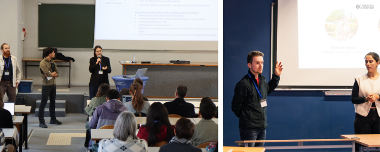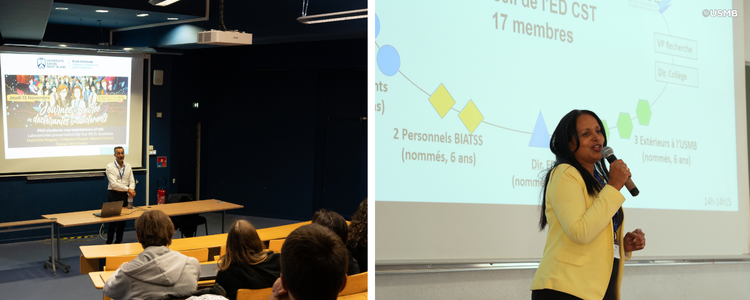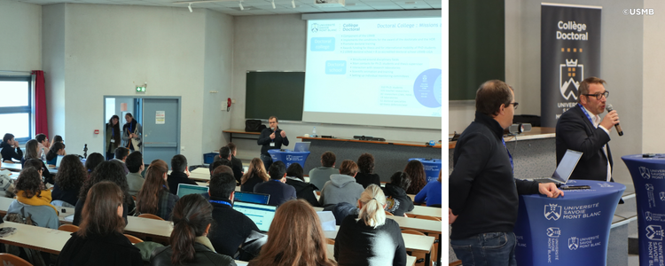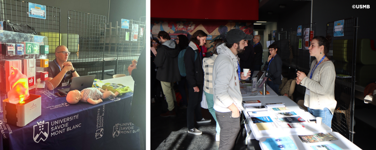 Des stands d’informations et sessions d’échanges ont ensuite été ouverts afin d’y présenter les différentes offres de formation accessibles lors du doctorat : les modules de formation à l’entrepreneuriat et à l’insertion professionnelle proposés en partenariat avec le Bureau d’Aide à l’Insertion Professionnelle (BAIP) et le Club des entreprises de l’USMB, le dispositif PITON, les formations à la pédagogie du département APPRENDRE, les offres de formation à la sécurité du service Prévention Sécurité, les Presses Universitaires Savoie Mont Blanc ainsi que les activités de vulgarisation scientifique menées par la mission Sciences et Société.