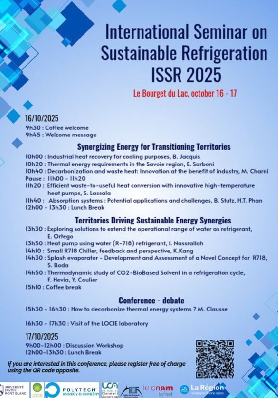 Le laboratoire de recherche Polytech LOCIE organise un séminaire international sur le thème de la réfrigération durable, à Polytech sur le campus du Bourget-du-Lac, les 16 et 17 octobre 2025.