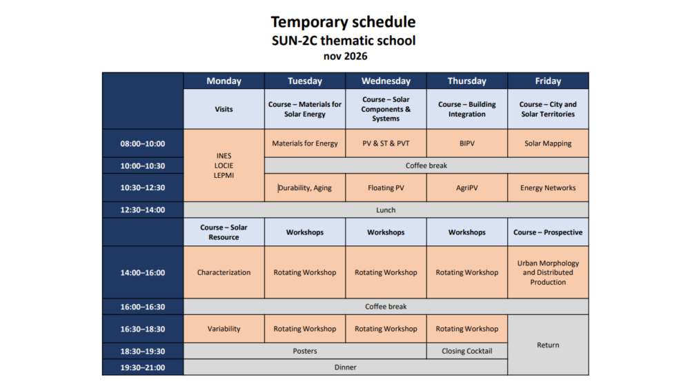 This thematic school builds on the EUR SOLAR ACADEMY (USMB, CNRS, CEA – PIA-EUR program ANR-18-EURE-0016 – Solar Academy), which was created to address this global challenge of deploying solar potential through concrete integration solutions from buildings to cities. The SUN-2C thematic school will play an important structuring role in the research activities conducted within this pillar and will contribute to the visibility of the research units involved and, more broadly, of Université Savoie Mont Blanc.